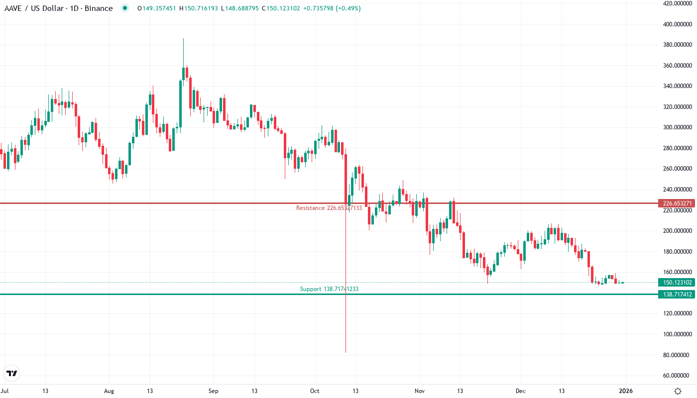 The setup will be broken if AAVE refuses hard at $155 and loses $138.72 on volume closes, which should force stops for oversold bounce buyers and likely spill over to the $119.69 monthly S2. A daily settle below $138 will in practice confirm the continuation of the mid-term downtrend, with $100 as the next major support from 2023’s accumulation zone.