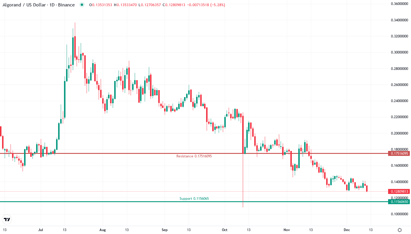 Algorand slid to $0.128 this week, extending a devastating 31% monthly collapse that puts the token dangerously close to testing yearly lows despite launching the blockchain industry’s first live post-quantum transactions. The disconnect between fundamental developments and price action tells a familiar crypto story – innovation alone can’t fight broader market forces when sellers dominate. The main question for traders is: can the much-tested $0.127 support hold through another assault, or will ALGO finally crack toward the psychological $0.10 level?