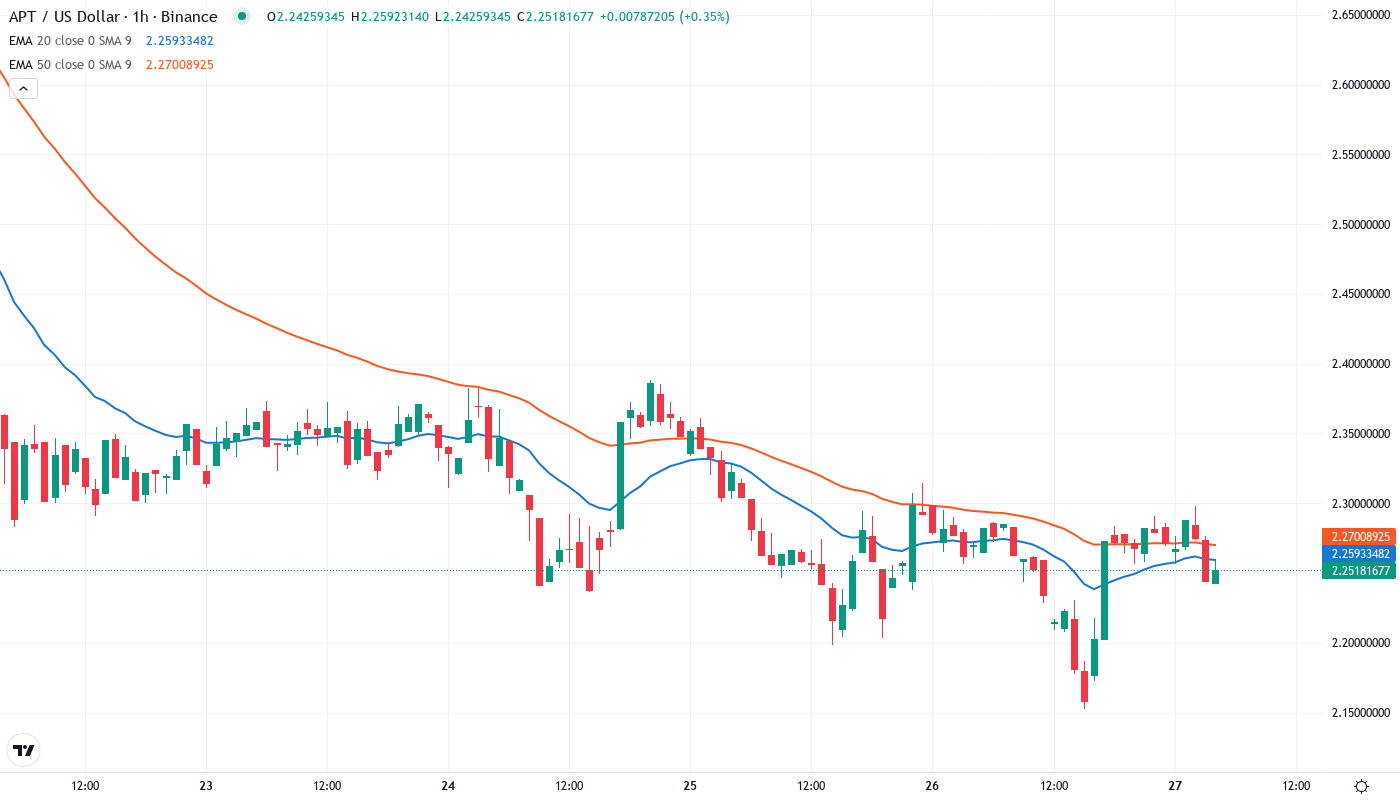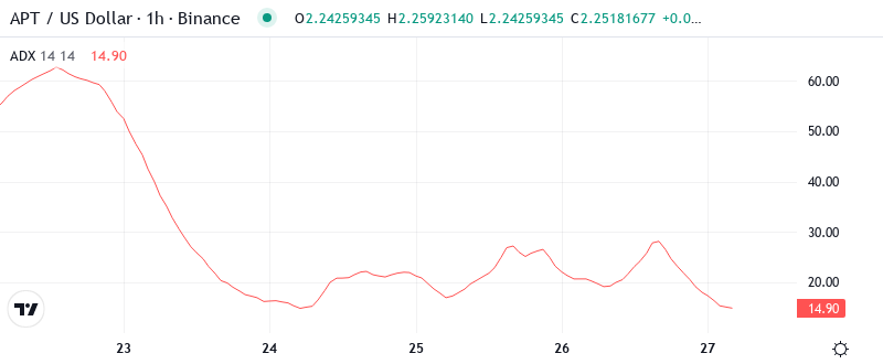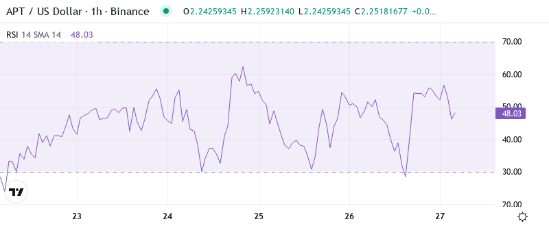Given the oversold bounce, extreme ADX readings, and fundamental catalysts from both Paxos and CreatorFi partnerships, the most probable near-term path sees APT consolidating between $2.15-$2.66 while building energy for a more decisive move once the stablecoin launches materialize into actual on-chain activity.