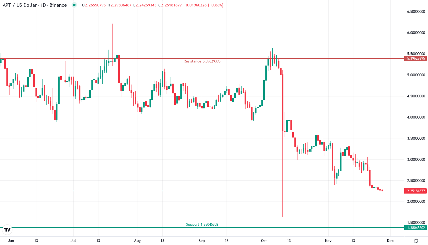 Aptos surged 9.7% over the past week, recovering from a devastating monthly decline that saw the token shed 34.8% from its November peaks. The rebound from $2.15 to $2.25 comes as major stablecoin players Paxos and CreatorFi announce Aptos as a primary launch network, injecting fresh momentum into an ecosystem that had been bleeding since late autumn. The main question for traders is: can this news-driven bounce transform into a sustained recovery, or will sellers use any strength to distribute remaining positions?