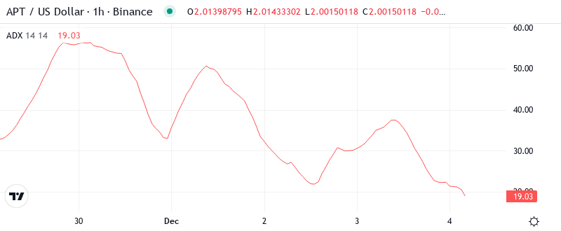 Trend strength exploded higher as ADX rocketed to 46.94, marking one of the strongest directional moves in APT’s trading history. At this extreme reading, the market has shifted from November’s choppy consolidation into a mature downtrend that typically exhausts itself only after touching major historical support levels – explaining why price sliced through multiple technical levels without pause.