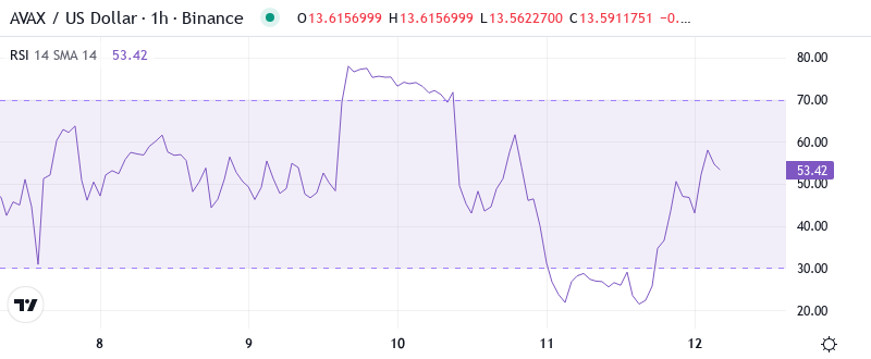 Price action reveals AVAX trading below the entire EMA ribbon, with the nearest resistance at the 20-day EMA ($14.13). The 50-day EMA sits higher at $16.19, while the 200-day EMA at $21.16 remains distant overhead resistance. This stacked configuration shows bears maintain structural control despite the recent bounce attempt.
