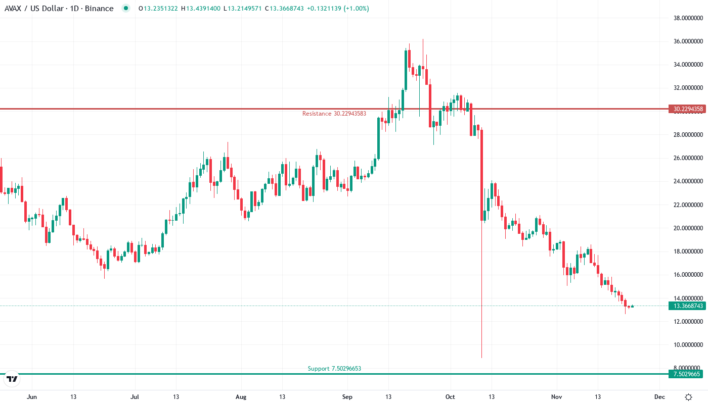 The bearish scenario triggers if AVAX fails to hold $13.37 on a daily close – this would likely flush remaining long positions toward the psychological $10 level. Given the extreme oversold conditions and mature downtrend readings, a breakdown here could paradoxically mark the final capitulation low, but traders would need to see clear reversal signals before attempting to catch that knife.
