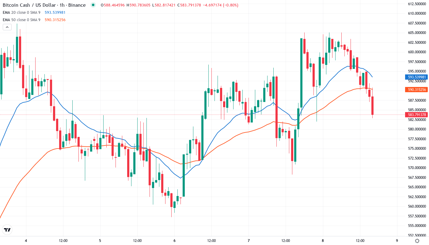 Support architecture looks more robust after this week’s price action, with the immediate floor at $584 (current price level) backed by deeper support at $552 (20-day EMA) and the critical $534-538 zone housing both 50 and 100-day EMAs. The fact that BCH bounced precisely from the $538 area last week before launching this 14% surge validates this zone as a technical floor bulls will likely defend aggressively.