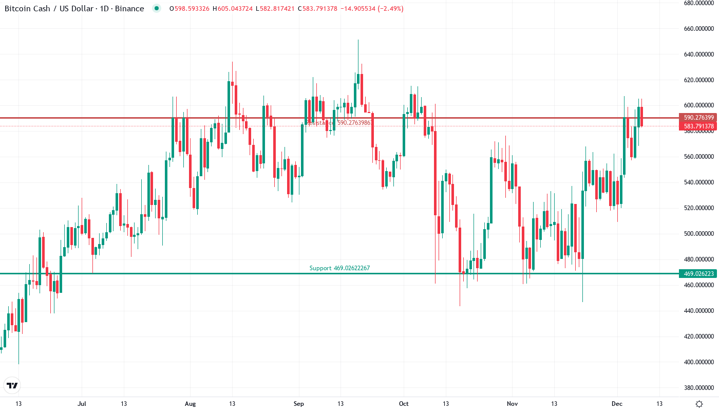 Bitcoin Cash has kick-started 2025 with a convincing 14% weekly surge to $584, outpacing all major Layer-1 cryptocurrencies and drawing attention from traders who’ve been waiting for altcoin leadership to emerge. The move comes as BCH recovered from December’s correction that saw prices tumble from the $607 monthly high, with bulls now guarding the higher lows they’ve set by taking back critical psychological price levels. The main question for traders is: can this momentum sustain above $584 support, or will sellers defend the overhead resistance stacking between $590-607?