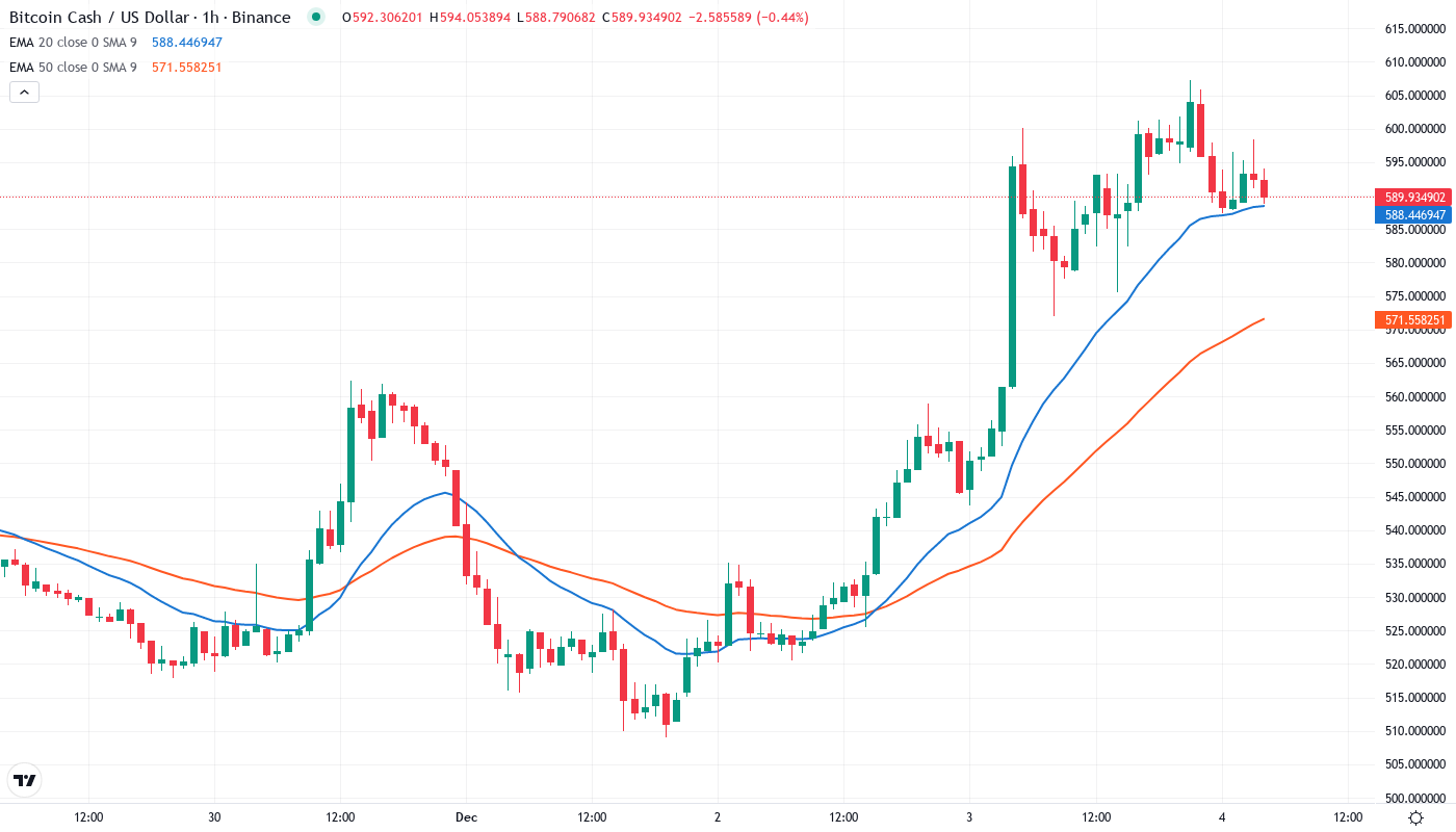 Price action through the EMA ribbons provides an interesting reversal narrative. BCH is now trading above the 10-day ($552.57), 20-day ($538.70), and most importantly, the 50-day EMA ($531.16), which blocked advances on three occasions since September before giving in this week. The 100-day EMA is at $531.14, making it essentially a double support zone needed to be protected by the bulls.