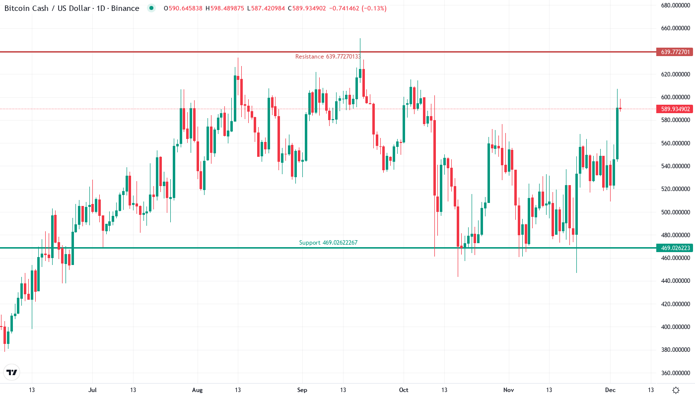 • BCH цена пробила уровень сопротивления $590 с объёмом на 18% выше среднего за 10 дней