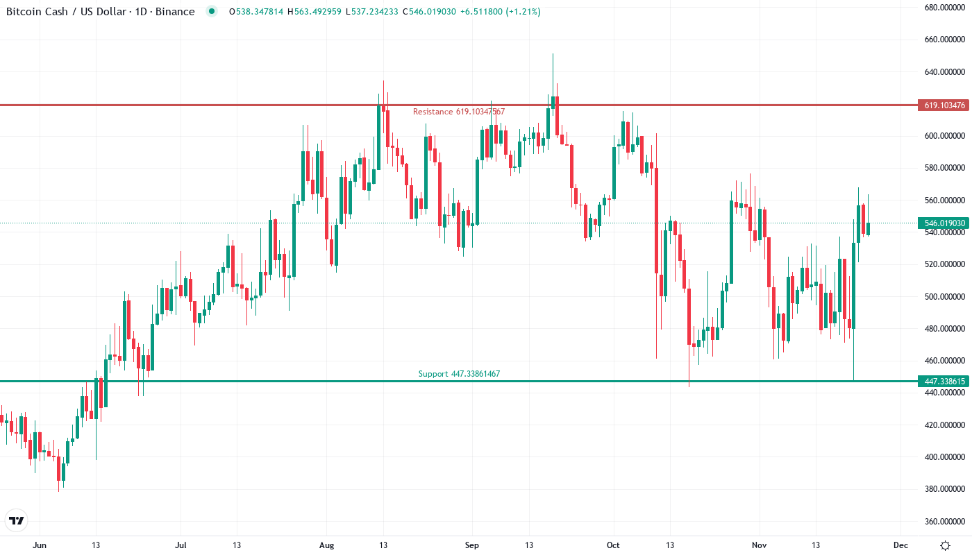 Based on all that technical setup and the fact that sentiment has begun to turn for the better following the security scare in October, the most likely immediate-term trajectory is that BCH will consolidate somewhere between $520 and $576 before making another assault on $600. Dips towards areas of support are likely to be bought rather than spark a stampede for the exit.
