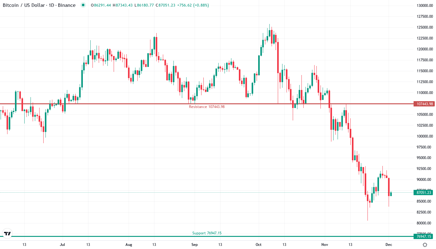Bullish reversal from this level could instead push the market back to the $92.7K weekly pivot, which would bring former support turned resistance at the monthly pivot above back into focus as the next upside target. There would still be a lot of technical damage left to repair before attempting a retest of the ATH, though many traders would see a successful defense of this support line as a bullish signal and potential long entry.