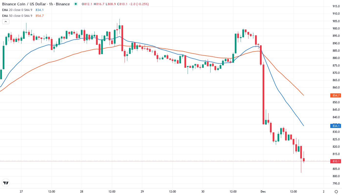 Price action tells a clear story through the EMA structure. BNB currently trades well below the entire moving average ribbon, with the nearest resistance sitting at the 10-day EMA ($868), followed by the more significant 20-day ($894) and 50-day ($953) levels. The 20-day EMA, which provided reliable support throughout November and early December, flipped to resistance after price crashed through it on heavy volume during the whale dump. This level now represents the first major hurdle for any recovery attempt.