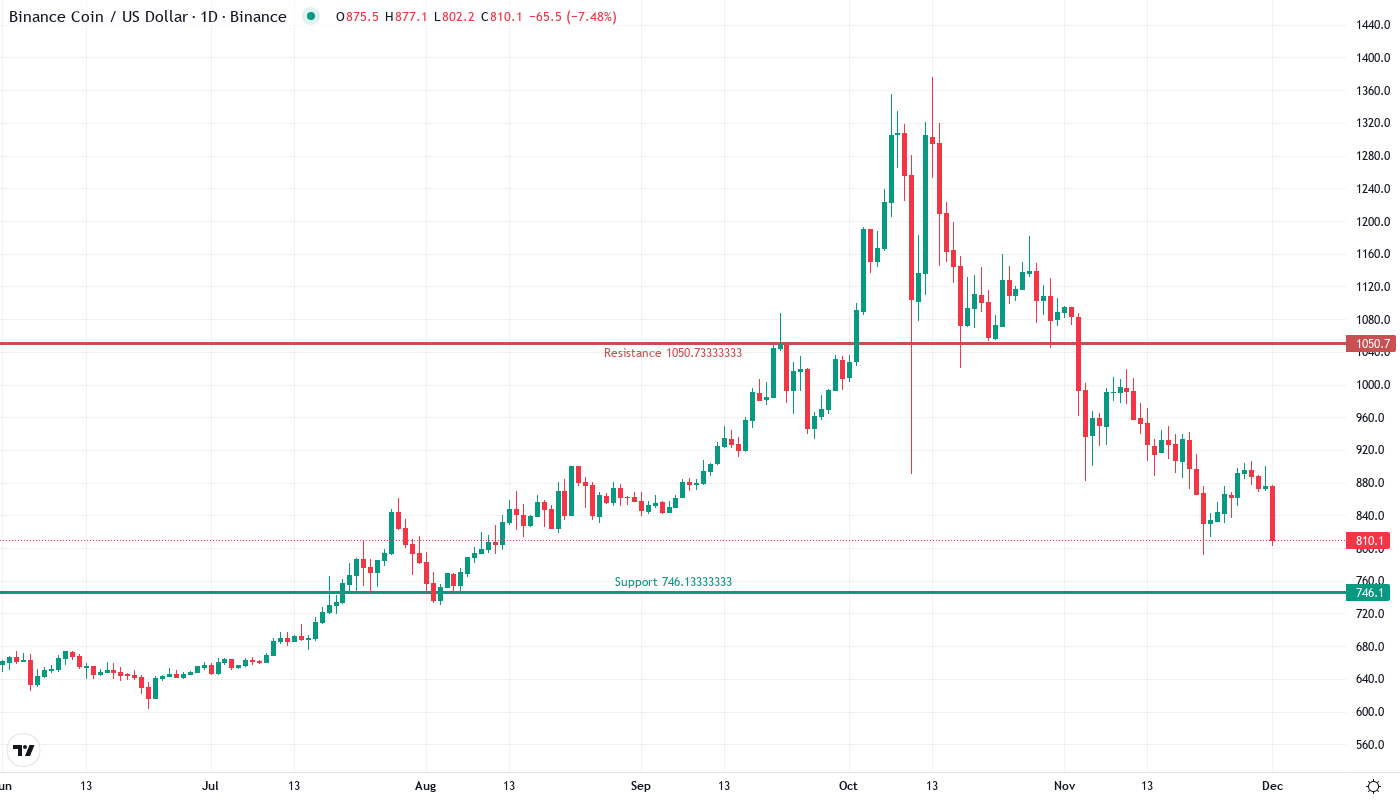 BNB has taken the elevator down this month, sliding from $1,095 to current levels around $812 – a devastating 25.4% drop that erased roughly $283 in value per coin. The collapse accelerated after news broke of a whale dumping $10.7 million worth of BNB, triggering stop-loss cascades below multiple support levels that had held firm since November. The main question for traders is: will the psychological $800 level hold, or are we headed for a deeper flush toward $700?