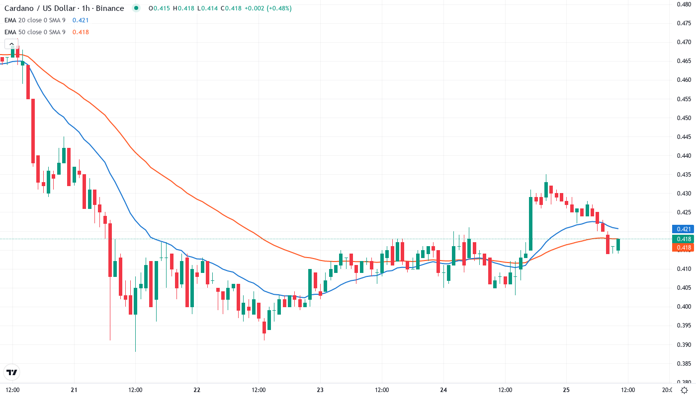 Support architecture looks dangerously thin after the cascade through multiple floors. The $0.417 current price hovers just above the monthly low at $0.388, which represents the last technical support before ADA risks testing 2023’s bear market lows near $0.35. What’s particularly concerning is how the AI sector turmoil news accelerated the breakdown through support – suggesting that any negative catalyst could trigger another leg lower. The weekly pivot at $0.405 offers minor support, but it lacks the historical significance to halt a determined selloff.