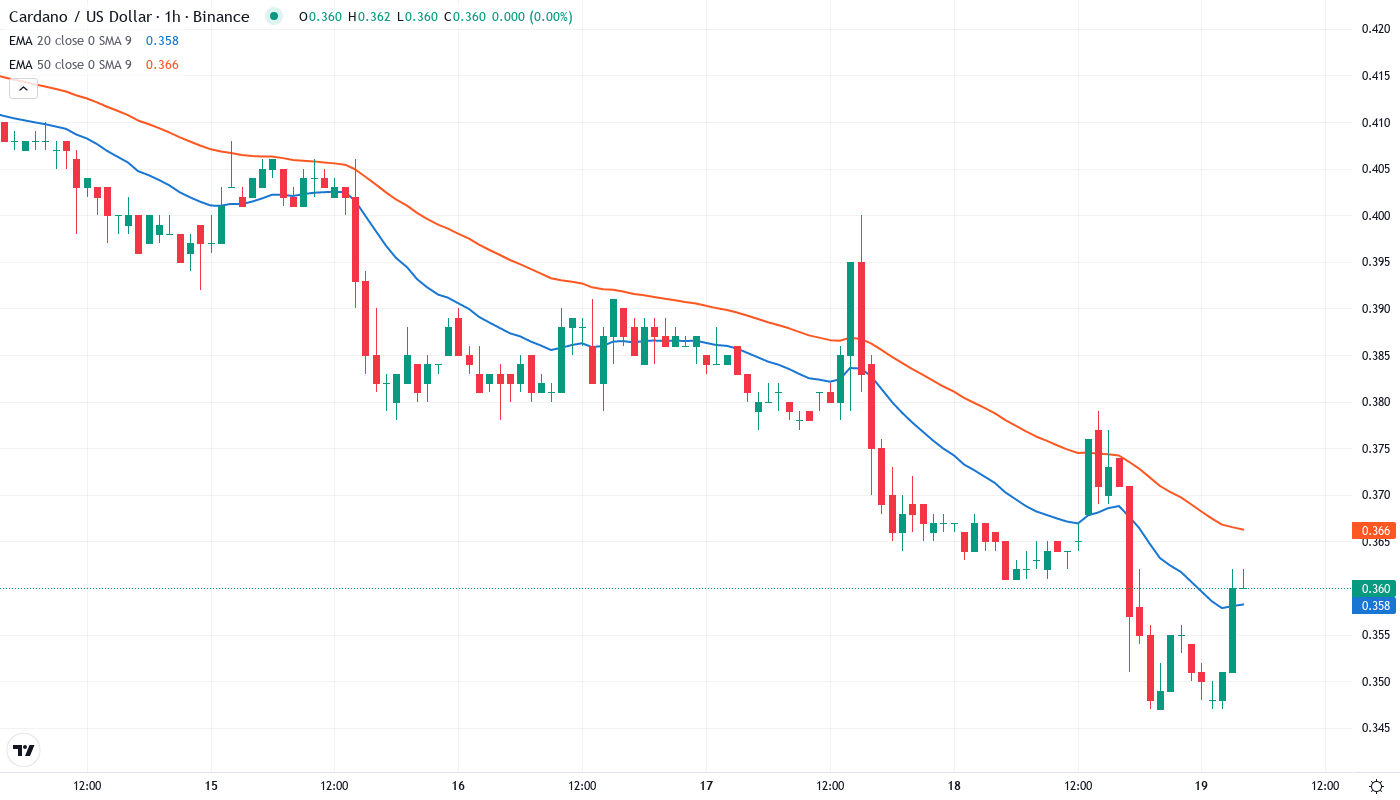 - Ключевые уровни сопротивления расположены на EMA ($0.387–$0.50), поддержка на $0.347 двойном дне.