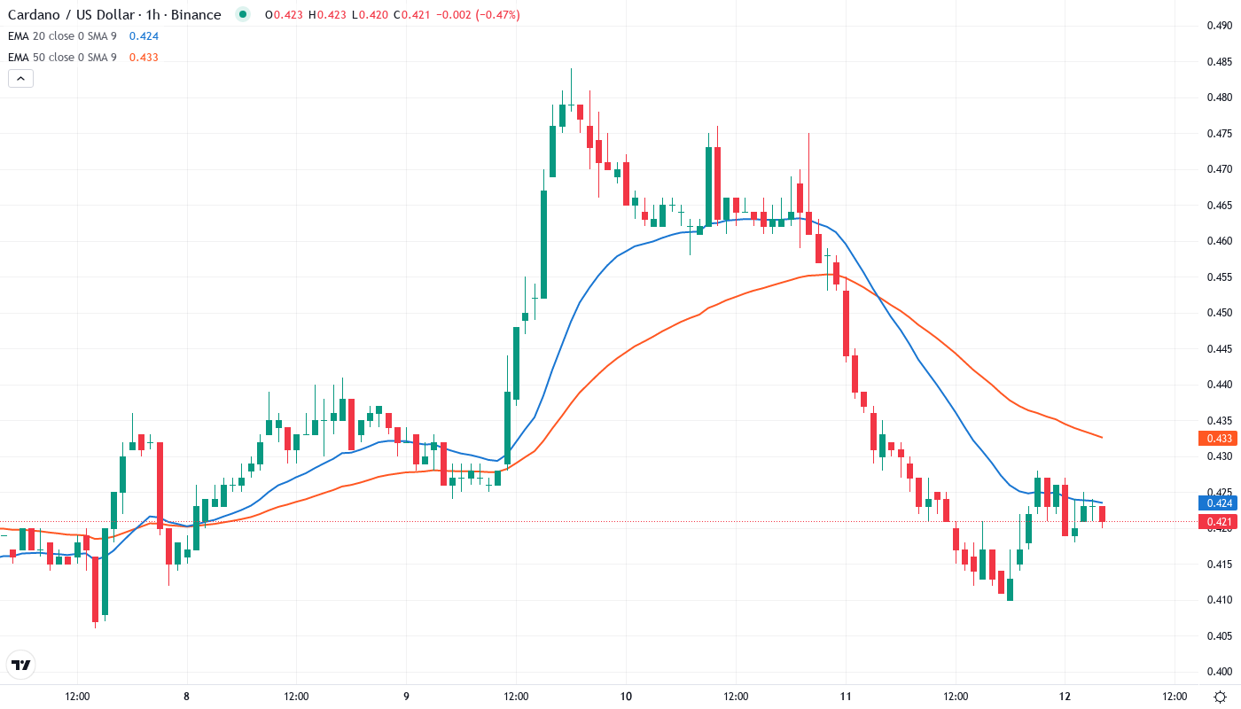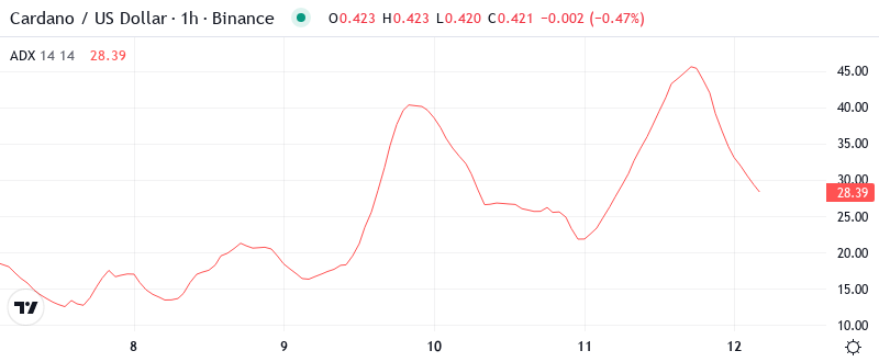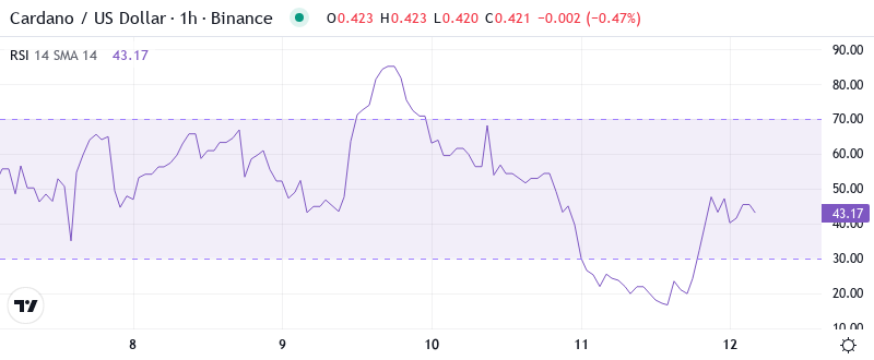 The Relative Strength Index (RSI) sits at 42.71 on the daily timeframe, where it is recovering from deeply oversold conditions that last matched levels seen during August’s capitulation phase. The oscillator’s bounce from the 20-level floor — territory such has historically marked exhaustion points for ADA — suggests that selling pressure may be temporarily spent.