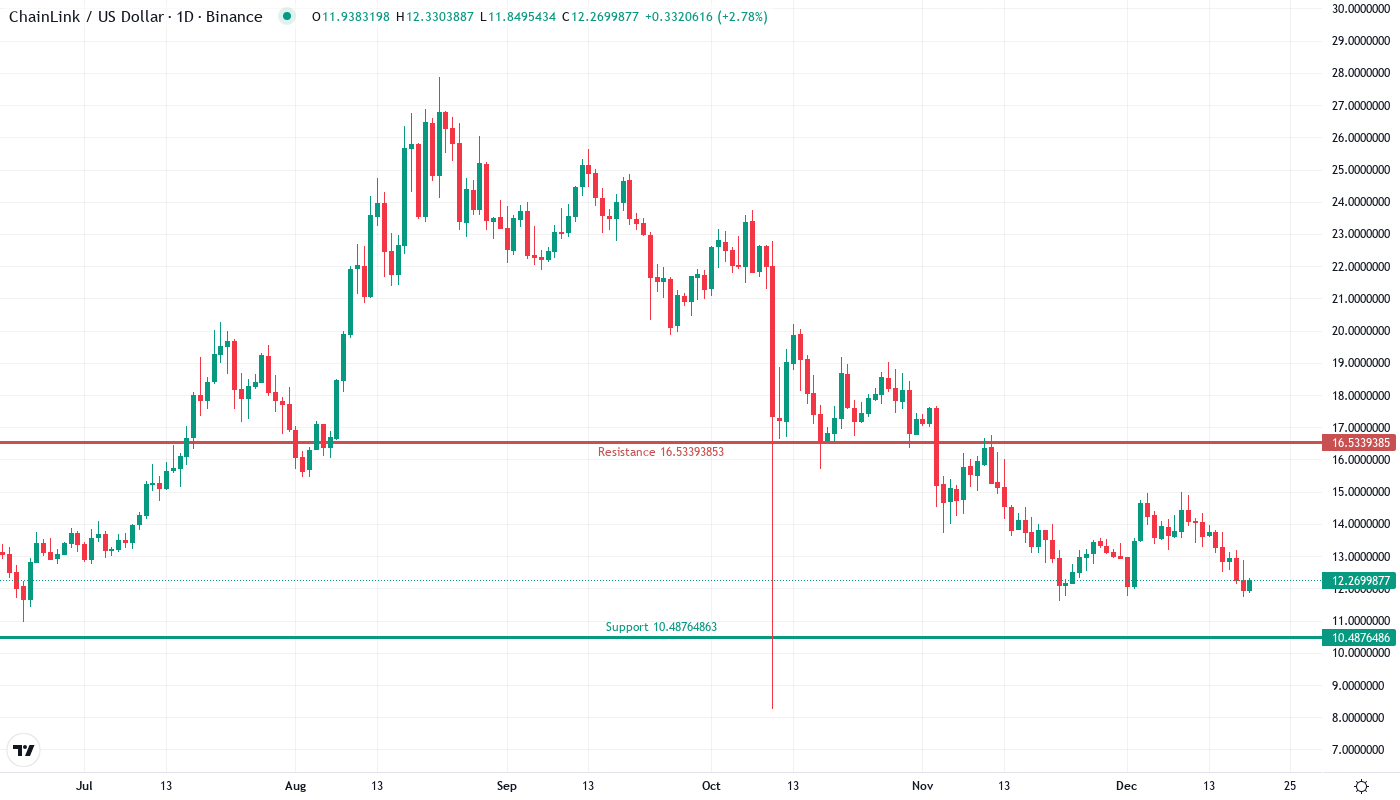 - LINK drops 12.8% weekly to $12.27, matching year-ago levels despite new enterprise partnerships