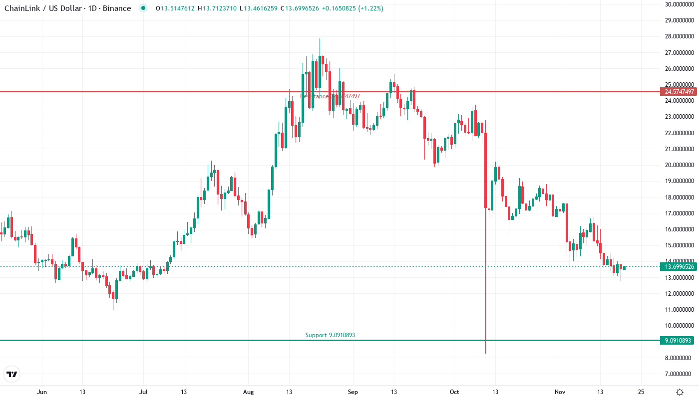 - LINK торгуется по $13.68, что на 27% ниже декабрьского максимума