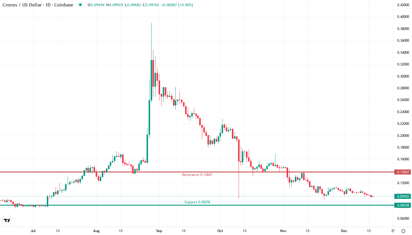 Cronos (CRO) has dropped 14% over the past month to $0.097, wiping out the November relief rally’s gains, while Crypto.com and 21Shares have capitalized on recent momentum in the benchmark cryptocurrency to launch new institutional-focused investment products. The token’s price performance leaves a less rosy picture — the icing hinting at bullish developments with the ETF and Cronos One gateway announcement was met with a solid dose of overhead ice encountering heavy selling pressure around the $0.117 resistance region. The $0.097 support level will see its seventh test since June.