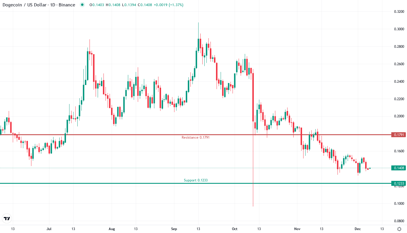 Dogecoin has tumbled 13.3% over the past month to $0.1408, erasing November’s gains as the broader crypto market cooled from its euphoric highs. The meme coin’s descent accelerated after rejection at $0.1857, but significant whale accumulation near current levels suggests institutional players see value at these prices – particularly with Buenos Aires’s groundbreaking decision to accept DOGE for tax payments. The main question for traders is: will this confluence of fundamental utility expansion and technical support hold, or are we headed for a deeper retracement to the $0.12 zone?