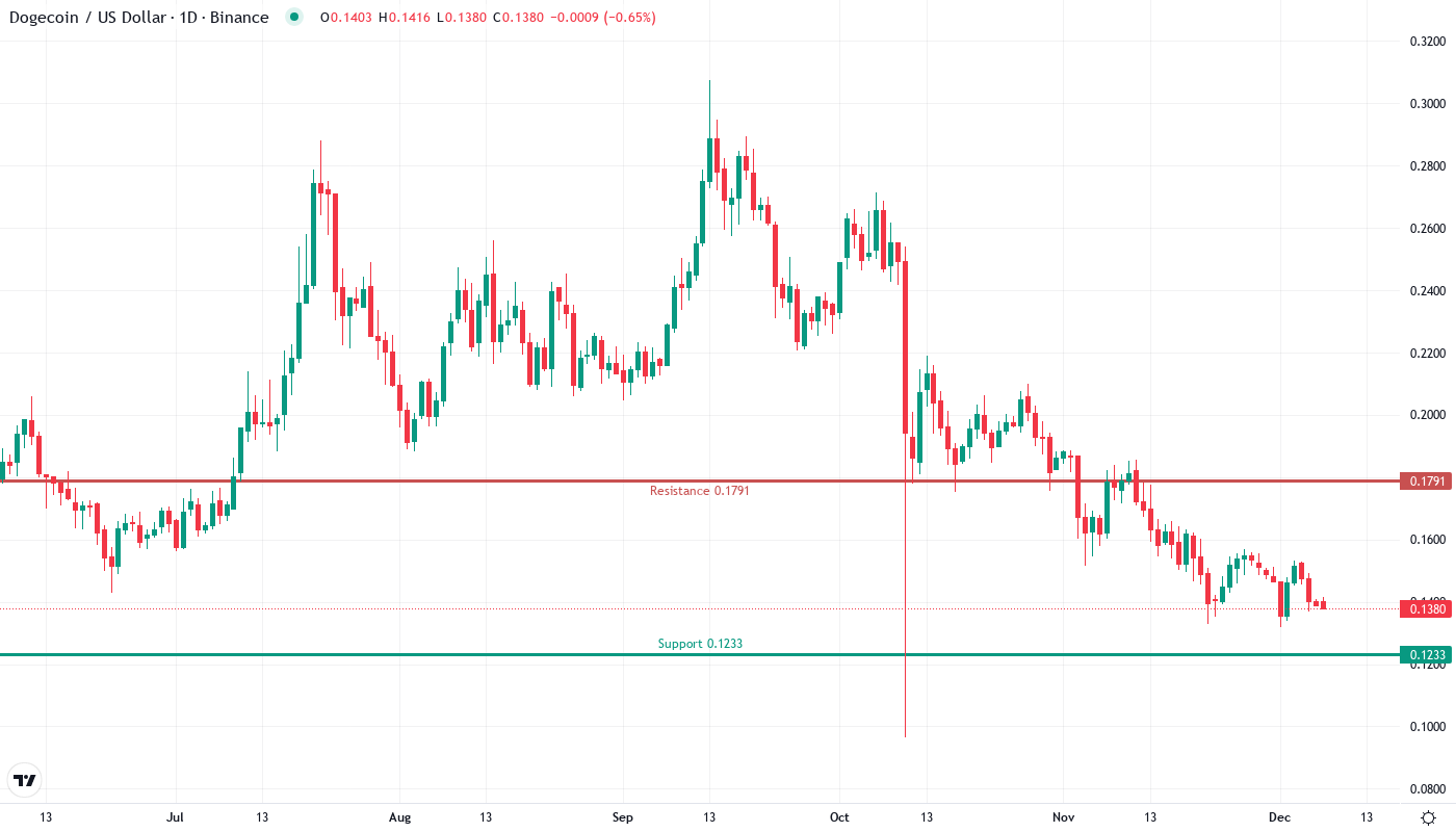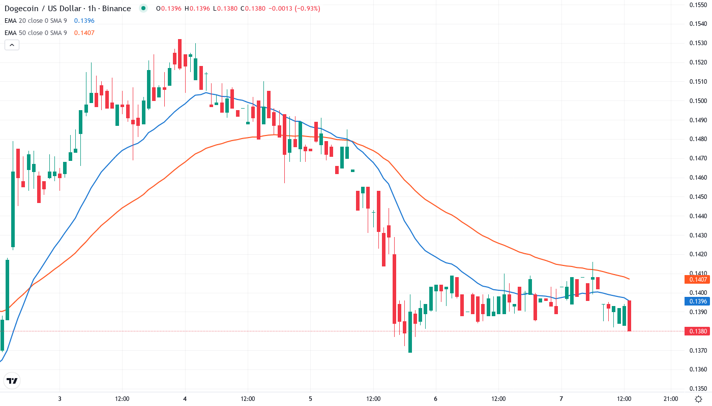 • DOGE slumps to $0.138, matching six-month lows despite whale accumulation of 550 million tokens