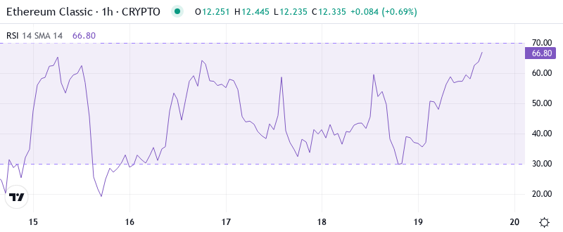 Price action tells a brutal story through the EMA ribbons. ETC trades below the 10-day ($12.59), 20-day ($13.02), and crucially, the 50-day EMA at $14.13 – creating a bearish stack that’s rejected every relief attempt since the Kaspa comparison news triggered December’s breakdown.