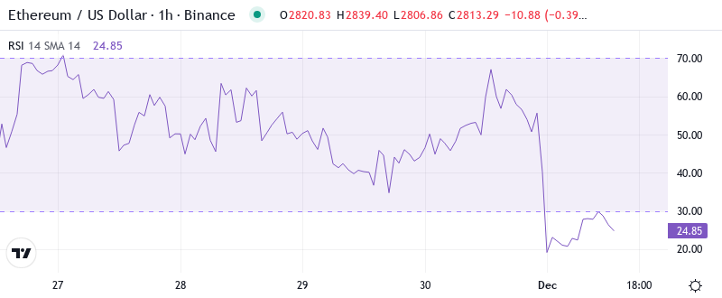 The Relative Strength Index (RSI) currently stands at 33.51 on the daily chart, the first truly oversold reading since August’s liquidity crisis threw ETH down to sub-$2,200 levels. What’s noteworthy is that momentum eroded steadily over the course of December – the RSI printed a reading of 65 during the swing high at $3,916 and has been cascading lower since, which solidified real downside pressure as opposed to a washout dump.