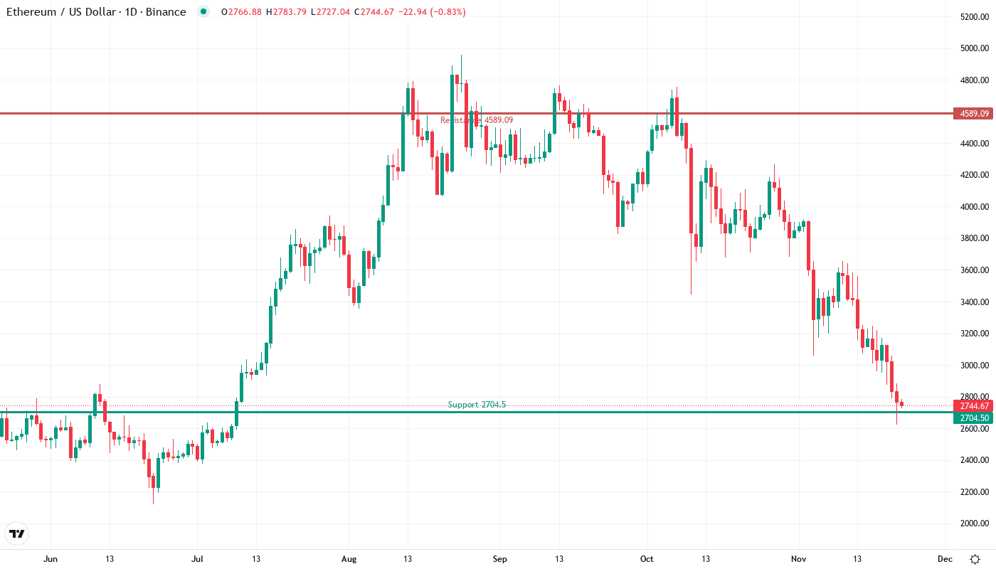 Should price reclaim the psychological $3,000 level with conviction, targets would extend toward the 20-day EMA at $3,215. The ETF momentum – with record volumes and renewed inflows – could provide the necessary catalyst for such a move. Bulls need to see follow-through buying after any initial bounce to confirm a sustainable bottom.