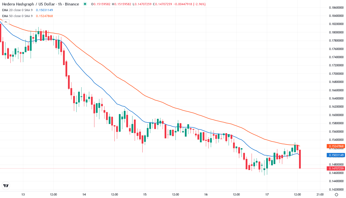 More worrying for bulls is that the 50-day EMA at $0.184 is now showing a downward slope for the first time since October. This level has transitioned from a rally-launching pad to a ceiling that has halted three distinct recovery efforts. As long as HBAR cannot establish itself back above this $0.184 level on a daily closing basis, the technical setup remains firmly bearish, with lower highs and lower lows firmly in place.