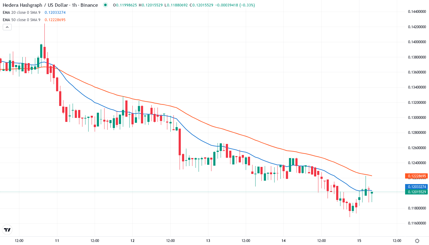 - HBAR consolidates near $0.12 after shedding 22% in the past month