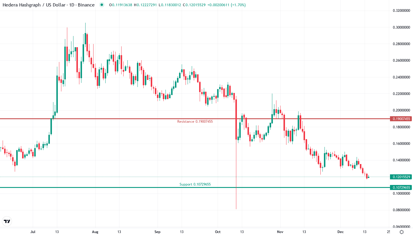 Hedera’s HBAR token trades at $0.120, marking a devastating 22% monthly decline that erased gains from November’s institutional partnerships. The token’s struggle to maintain momentum despite significant real-world adoption news – including this week’s blockchain implementation agreement with Georgia’s Justice Ministry – raises questions about whether technical exhaustion or broader market dynamics are overwhelming positive fundamentals. The main question for traders is: can HBAR’s six-time tested support at $0.117 hold against persistent selling pressure, or will the disconnect between bullish news and bearish price action continue?