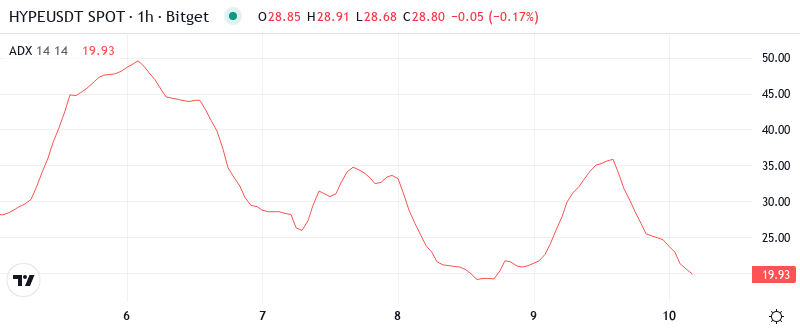 To clarify, the ADX is indicating that we are switching from a directional downtrend to more two-way price action. Therefore, day traders should adjust their strategies from trend-following to range-trading setups, particularly as the new leveraged stablecoin trading features and USDC cross-chain integration attract fresh liquidity flows that could create volatility without clear direction until buyers or sellers definitively take control above $30 or below $27.