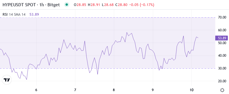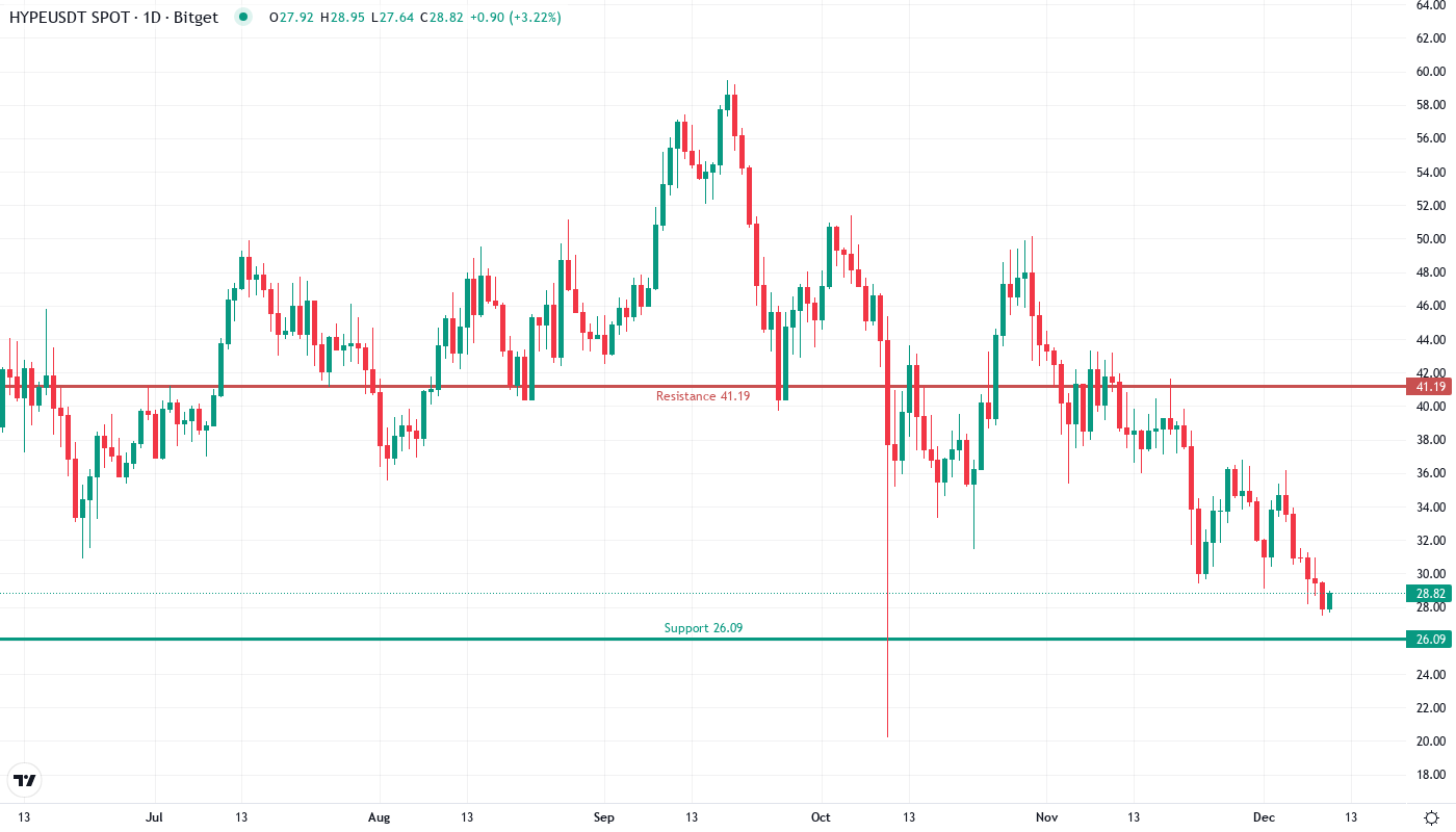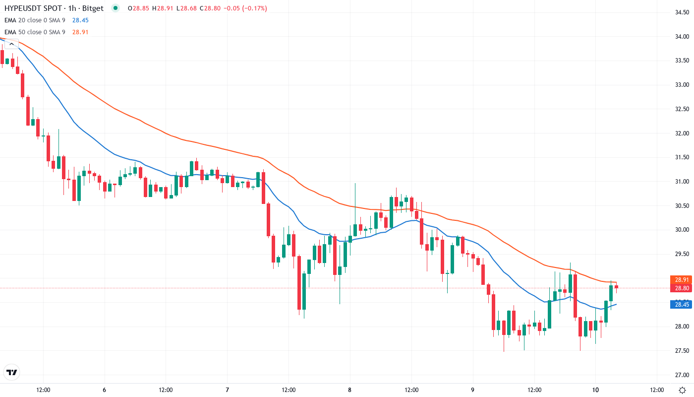 - HYPE trades at $28.81, down 31% over the past month but holding above key support at $27.47