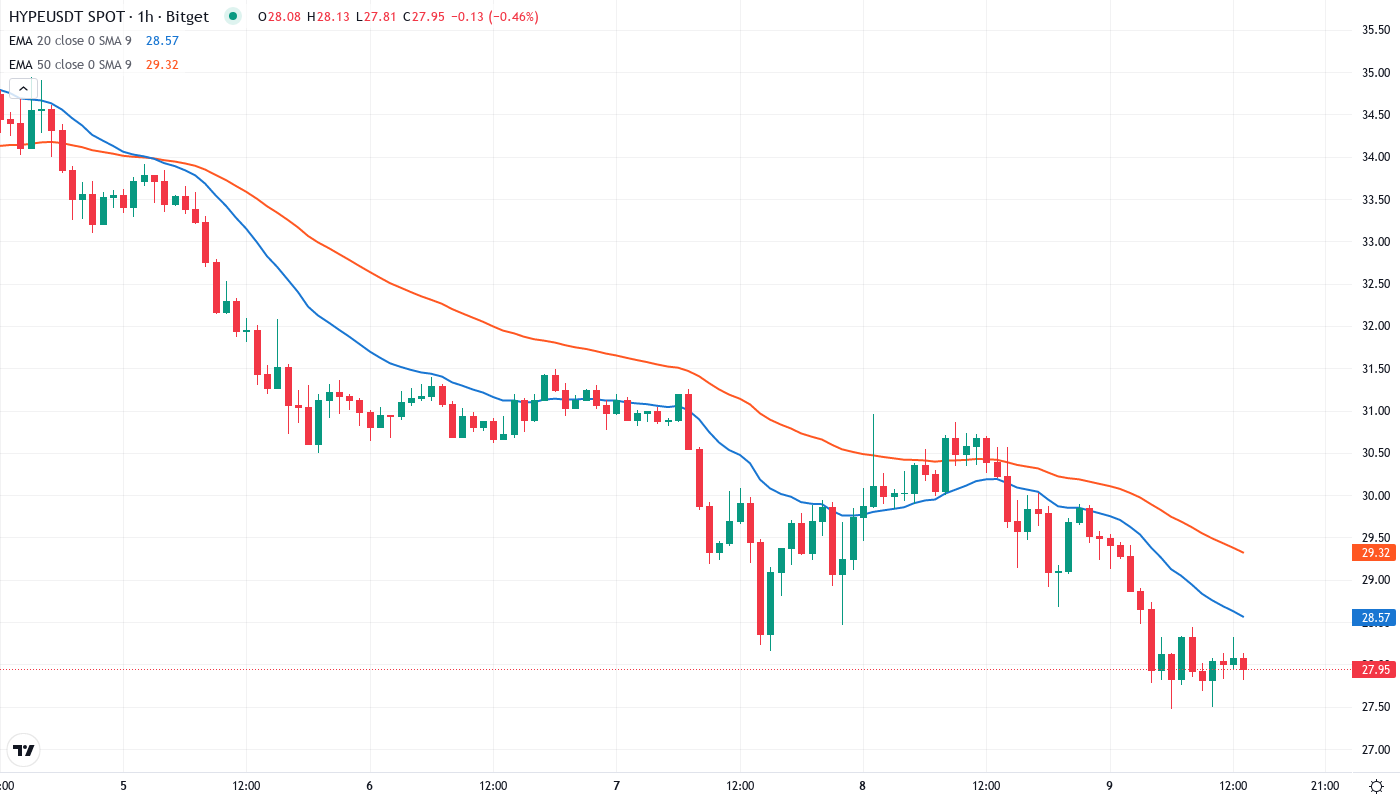 The bearish scenario triggers if HYPE fails at the $30-31 resistance cluster and breaks back below the 20-day EMA at $27.06 on volume. Such a rejection would likely trap recent buyers and target a retest of $24.46 support, with failure there opening an air pocket to the $20 level where the 200-day EMA waits.