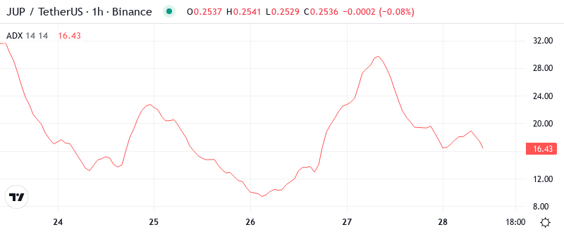 Looking at trend strength, the ADX reading of 43.12 flashes a clear warning – this isn’t some minor correction but a full-blown trending move with real conviction behind it. Basically, when ADX climbs above 40, it signals that one side has taken complete control of the market, and in JUP’s case, that’s been the bears who’ve driven price down relentlessly since the security breach news broke.