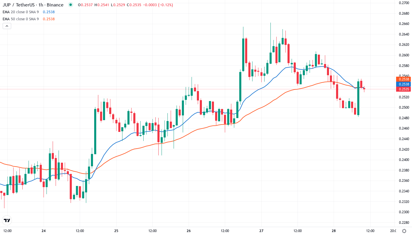 Jupiter’s price action tells the story of a token in freefall, with JUP plummeting 41.22% over the past month to trade at $0.2531 – a devastating drop that erased over half its value from recent highs. The Upbit security breach that saw $36M worth of Solana ecosystem tokens stolen, including Jupiter, triggered panic selling that overwhelmed any positive sentiment from the Metis v7 spinoff announcement. The main question for traders is: has JUP found a floor at these levels, or does the technical structure suggest more pain ahead?