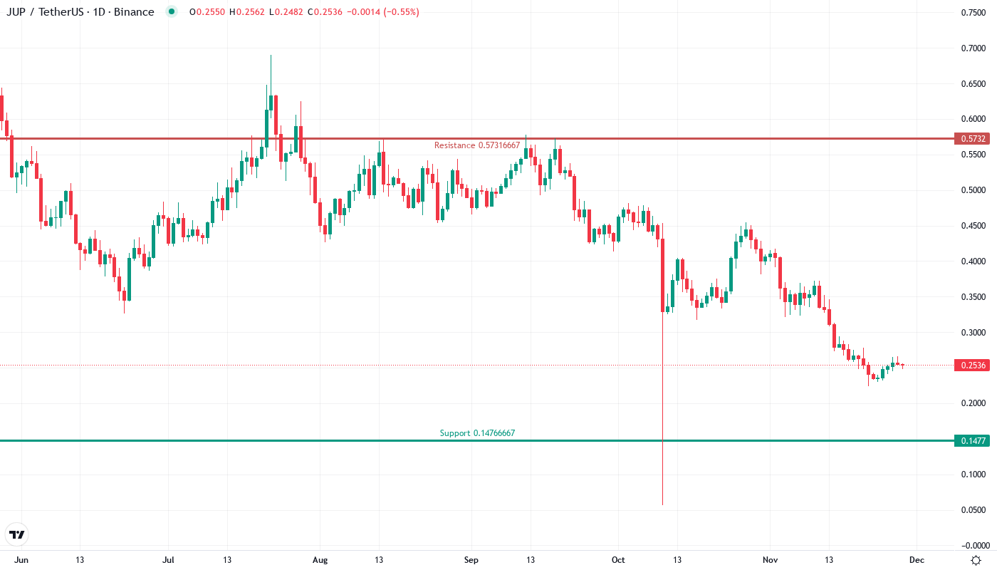 - JUP crashes to $0.25 after devastating 41% monthly decline – worst selloff since launch