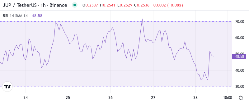 The moving average structure paints a grim picture for bulls. JUP trades below every significant EMA – the 10-day at $0.257, 20-day at $0.278, and critically, the 50-day EMA at $0.299 which previously acted as support multiple times before the breach. Each of these levels transformed from support to resistance during the cascade, creating a stacked barrier that price must overcome to signal any meaningful recovery.