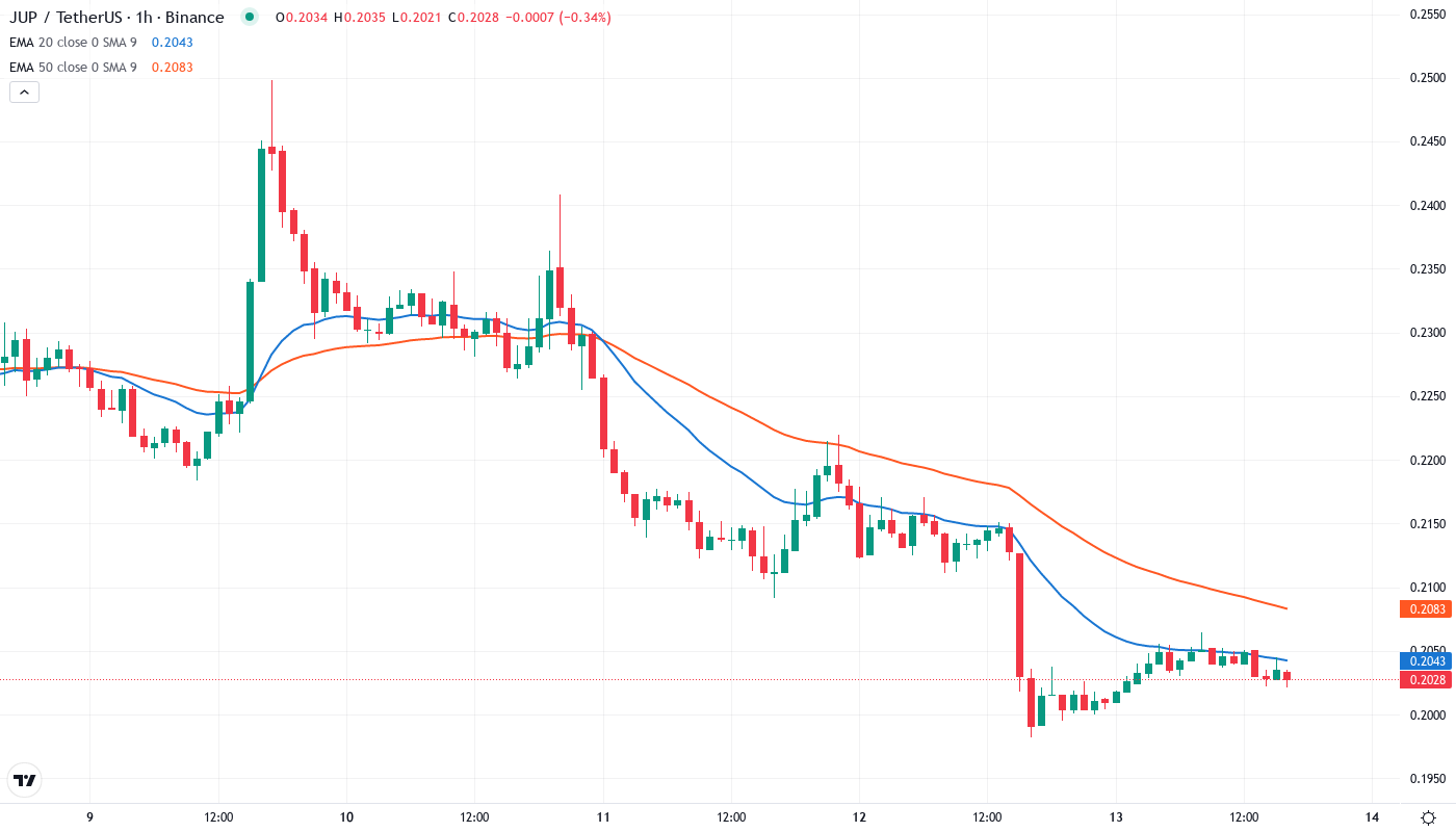 Most significant is the 50-day EMA at $0.285, which rejected price three times this month before the JupUSD announcement. That former support level now acts as massive overhead resistance, requiring a 40% rally just to reclaim. The 20-day EMA at $0.236 presents the first major hurdle for any recovery attempt, sitting 16.5% above current levels and aligning with the psychological $0.25 area where trapped longs may look to exit.