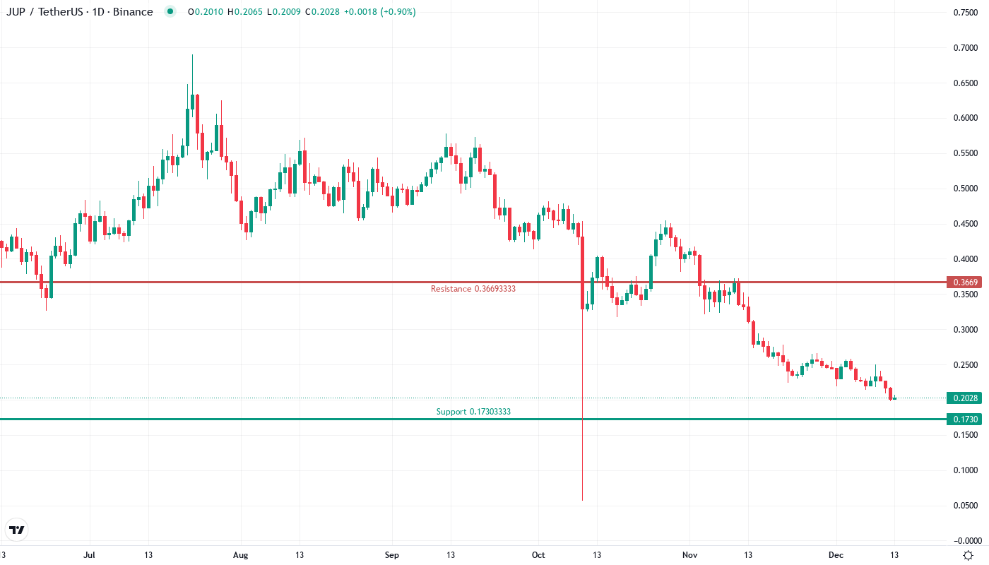 The bearish scenario triggers if $0.1982 support breaks on volume, opening a direct path to $0.15 where no historical support exists. Loss of this critical level would trap recent buyers betting on the JupUSD catalyst and likely trigger another wave of forced liquidations. Bears remain in control as long as price holds below $0.236, with each failed rally attempt reinforcing the descending channel structure.