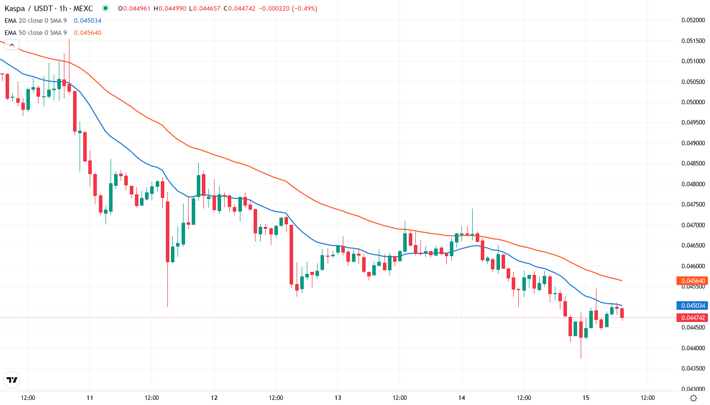 This configuration resembles a compressed spring, with narrowing ranges despite high volatility. The structure signals buyers’ conviction as long as they keep $0.044 intact on any retracement. It is worth mentioning that similar compression patterns in KAS historically resolved with 20-30% directional moves once the range breaks – making the current setup particularly compelling for patient traders.