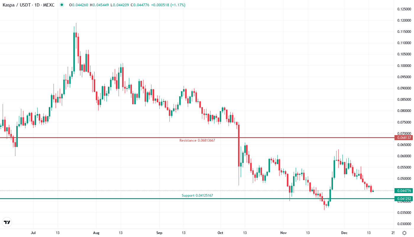 - KAS dropped 13.11% this week to $0.0447, testing multi-month support levels