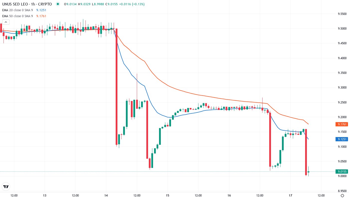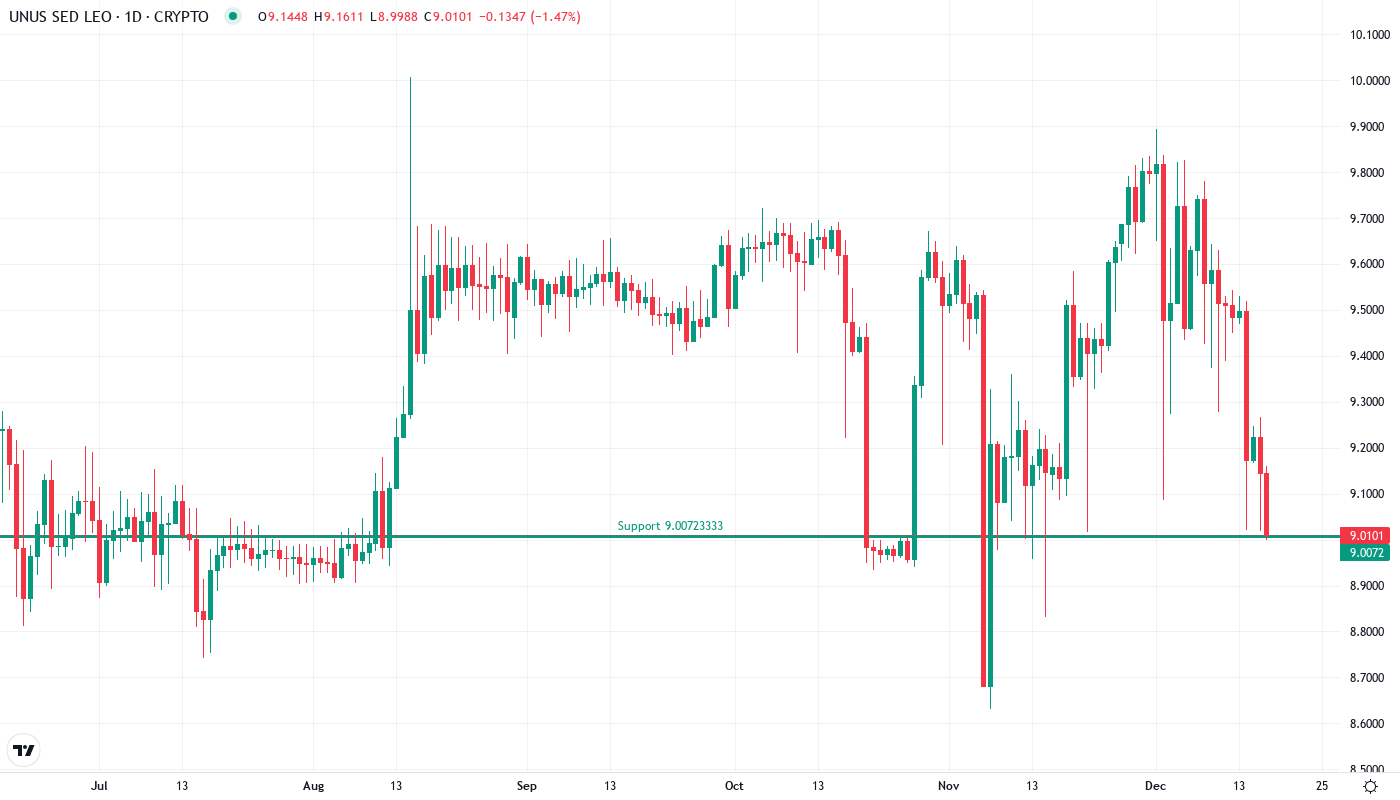 UNUS SED LEO dropped 5.93% over the past week, settling at $9.02 as the exchange token struggled to maintain momentum above the psychological $9 level. The token’s monthly performance shows a marginal 1.52% decline, though it has managed a slight 0.41% gain over the past three months – suggesting a prolonged consolidation phase rather than an outright bearish reversal. The main question for traders is: will LEO defend the $9 support that has anchored price action throughout December, or are we witnessing the early stages of a deeper correction?