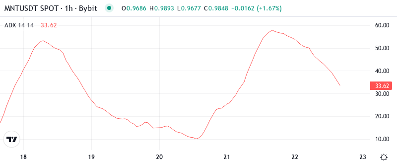 Trend strength readings paint a clear picture with ADX climbing to 29.24, marking the shift from November’s choppy consolidation into directional movement – unfortunately for bulls, that direction is decisively down. The indicator crossed above 25 just as MNT broke below the $1.20 support zone, and its continued ascent toward 30 signals sellers maintain control despite Anchorage Digital custody news that should theoretically attract institutional flows.