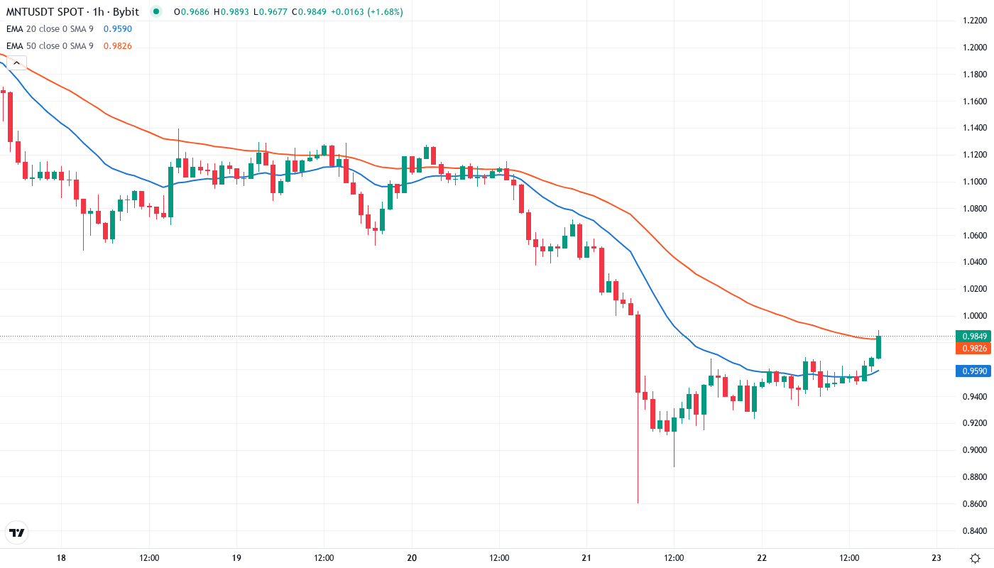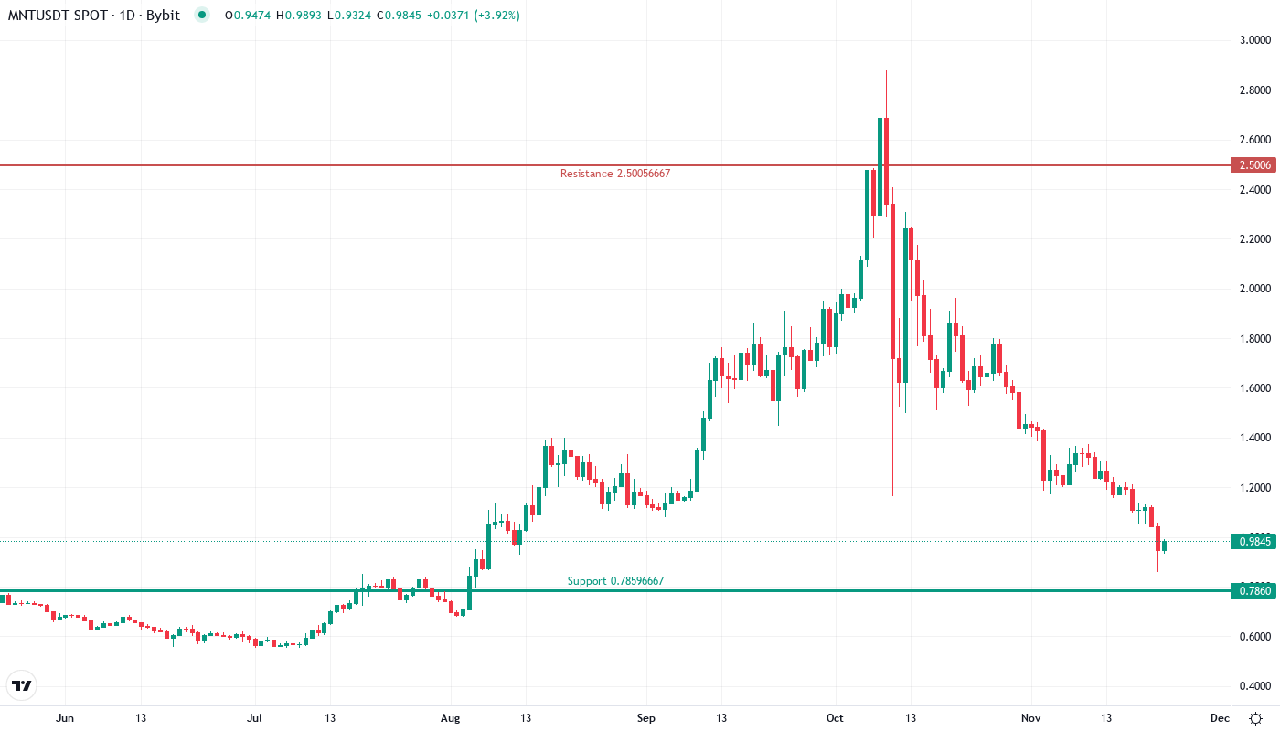- MNT hovers at $0.9854, down 38.2% from monthly highs despite major institutional announcements