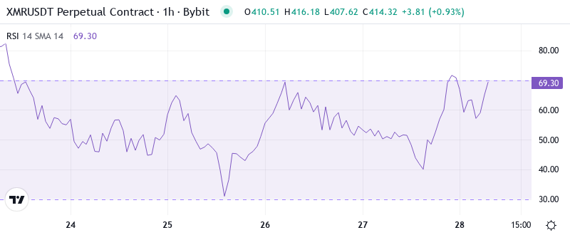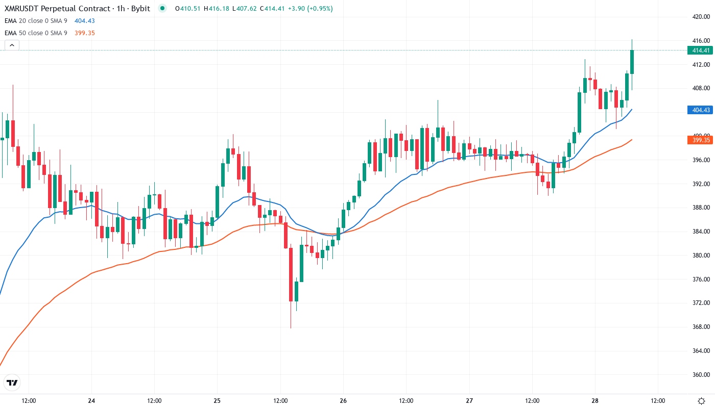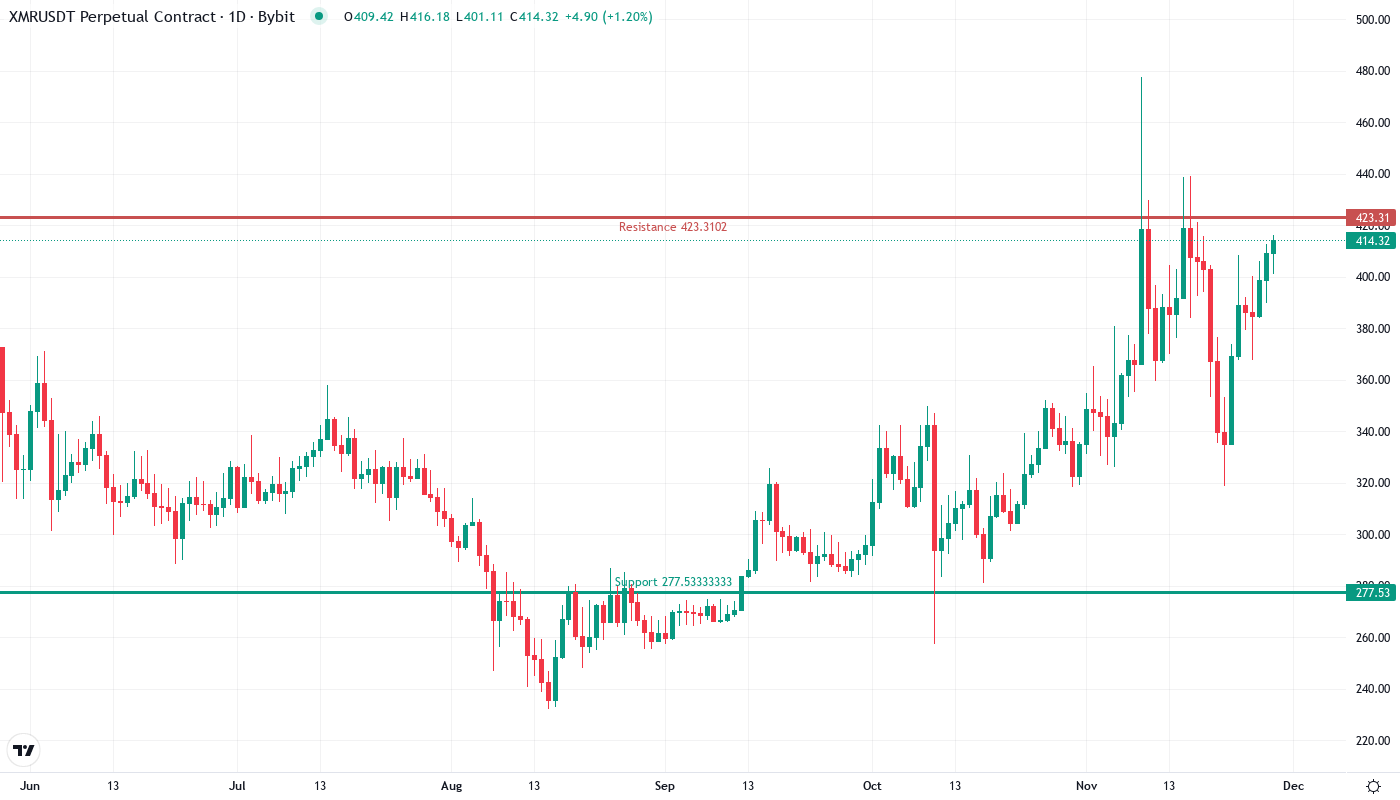 - XMR trades at $415.01, extending a remarkable 165.98% yearly gain