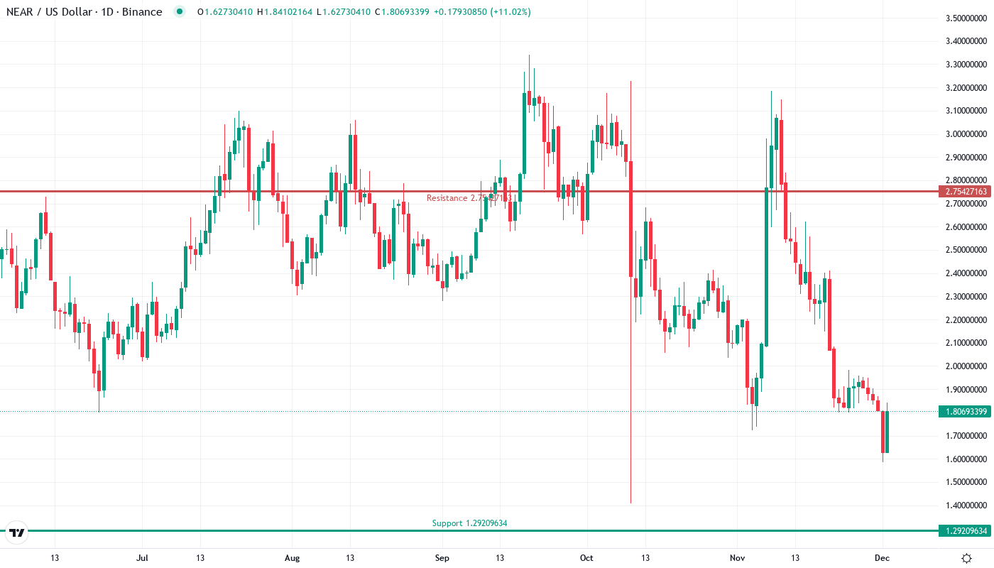 - NEAR trades at $1.80, matching crucial support after a devastating 27% monthly drop