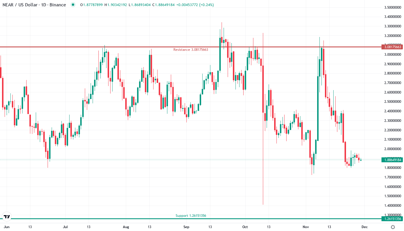 Should NEAR reclaim the 20-day EMA at $2.08 with volume, the technical picture shifts dramatically. Such a move would trap late shorts while confirming Van de Poppe’s bottom call, opening a path toward $2.26 and potentially $2.50 if the Intents momentum translates to price appreciation. Bulls require this level on a daily close, not just an intraday spike.