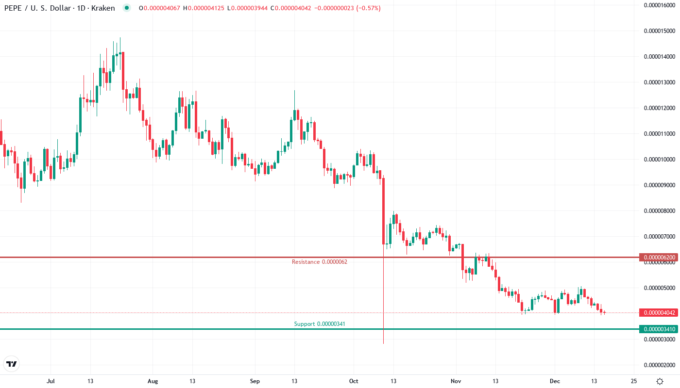 Buyers need to prevent a deeper fall or PEPE may visit the April low ($0.00000255) and form a double bottom with a slightly lower low between $0.00000241–$0.00000250.