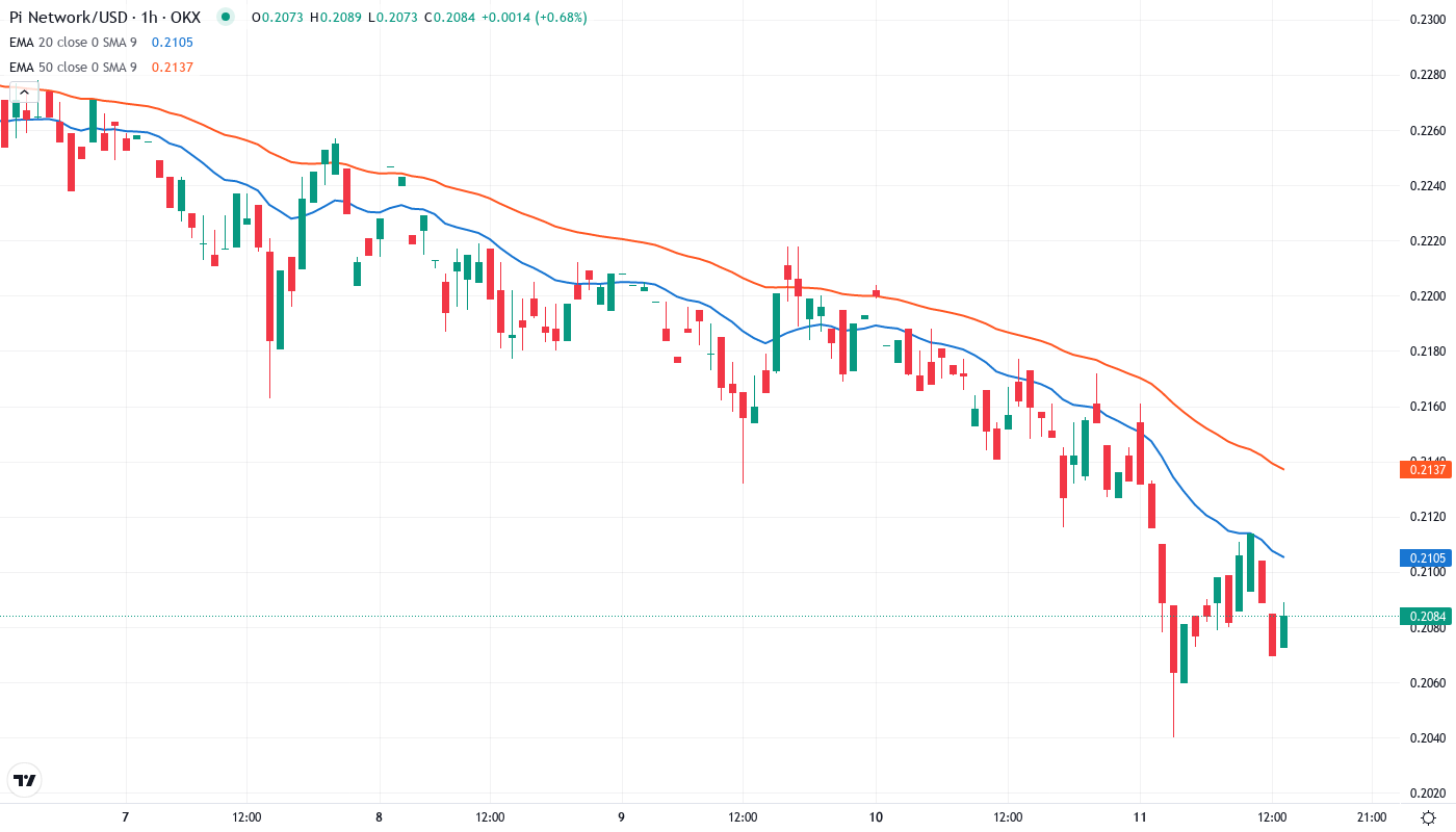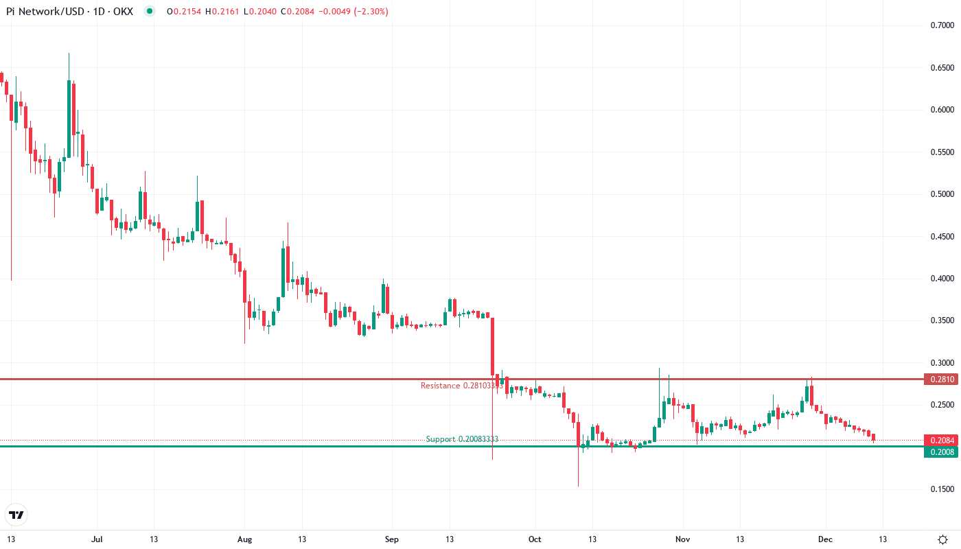 The bearish scenario triggers if price rejects hard at $0.227 and breaks below $0.204 support on heavy volume – this would trap recent bottom-fishers and likely cascade toward $0.162. Legal resolution unfavorable to Pi Network or confirmation of "heavy unlocks" would accelerate such a breakdown.