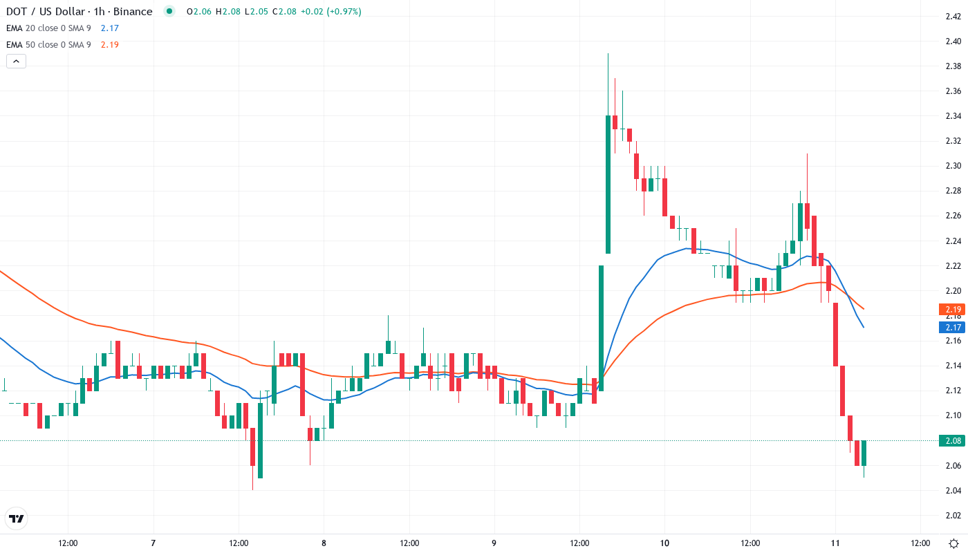 Given the technical configuration and momentum dynamics, the most probable near-term outcome sees DOT grinding between $1.95 and $2.15 before ultimately resolving lower. Without a significant fundamental catalyst beyond the already-digested ETF news, bears maintain control of this market with each bounce providing better short entries rather than accumulation opportunities.