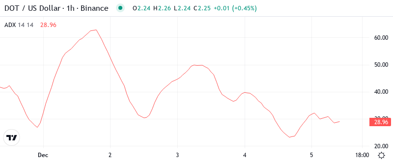 At the level of 37.23, the ADX entry indicates that the current downtrend has significant power behind it – we’re well past the choppy consolidation phase and deep into directional movement territory. Basically, when ADX readings climb above 35, it signals that the prevailing trend (in this case bearish) has reached a mature state where exhaustion becomes increasingly likely. The last time DOT’s ADX hit these levels was during the November flush that marked the previous cycle low.